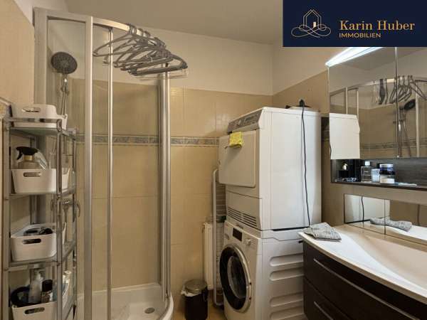 - Badezimmer mit Doppelwaschbecken, Dusche, Waschmaschine und WM-Anschluß