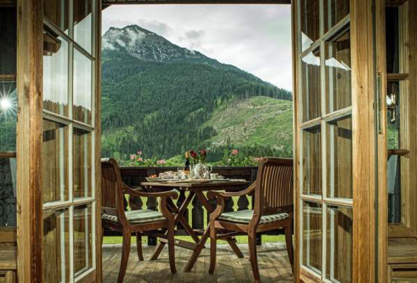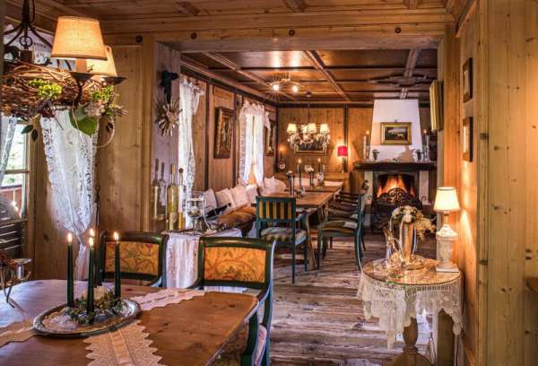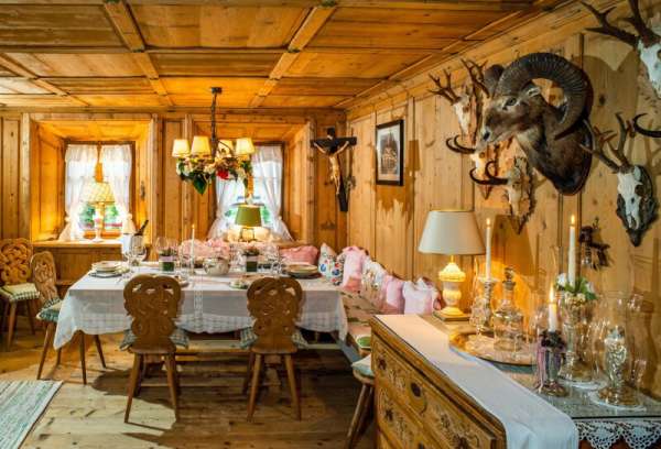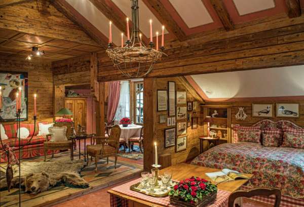 Das Hauptgebäude selbst wirkt durch seine Größe und rustikale Optik wie ein herrschaftliches Jagdschloss mit allen Attributen, wie einem eisernen Einfahrtstor mit einer baumgesäumten Zufahrt, einem Burgturm, mehreren Bachbrücken und klassischen Windläden sowie diversen Jagdtrophäen. Auch die Räumlichkeiten im Inneren sind elegant und charmant, teils opulent und mit viel Liebe zum Detail ausgestattet. Klassisch rustikale Antiquitäten, handgefertigte Holzarbeiten